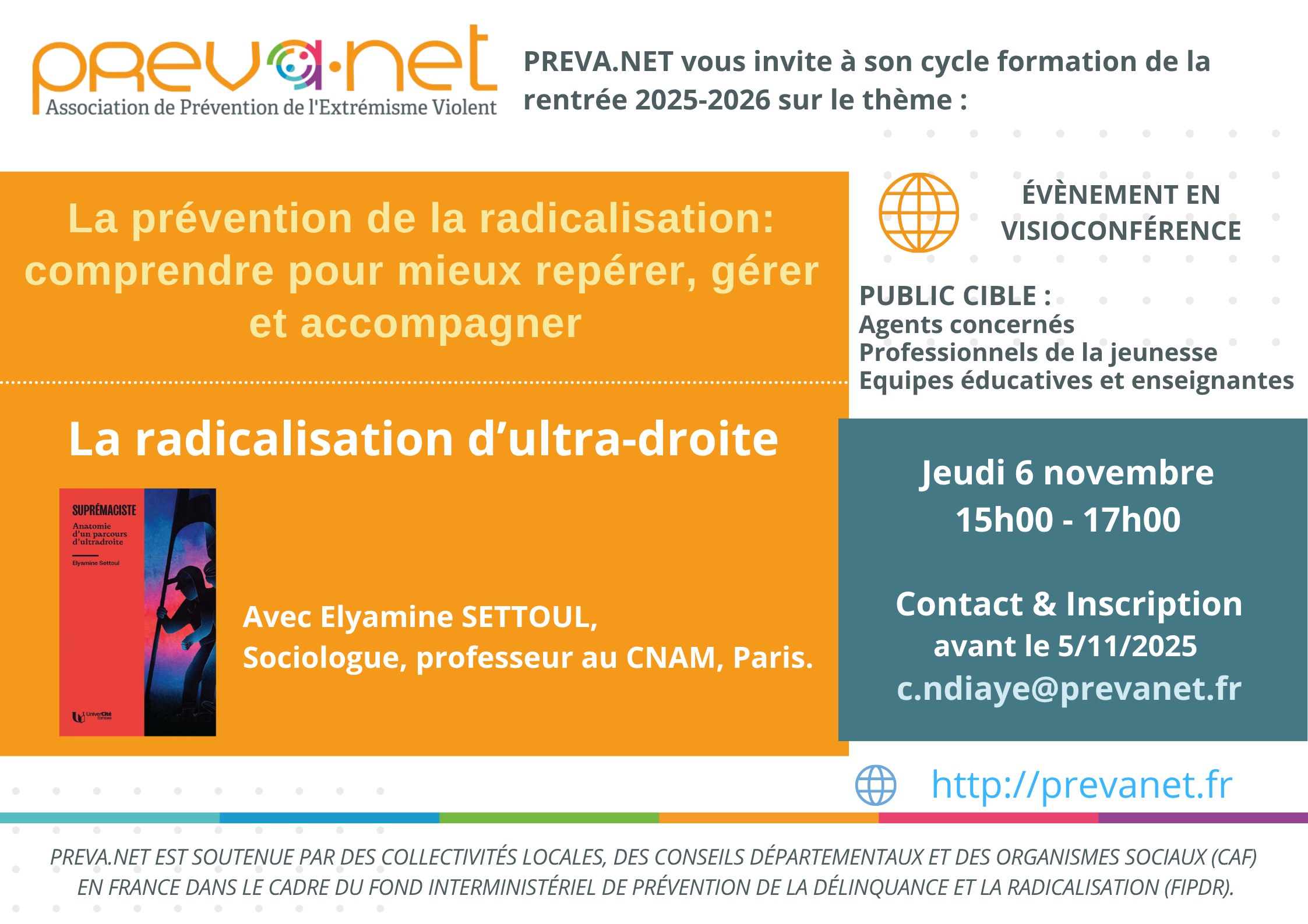 Visioconférence : Comprendre la radicalisation d’ultra-droitePREVA.NET vous invite à une visioconférence animée par Elyamine Settoul sociologue et professeur au CNAM, autour d’un sujet essentiel :la radicalisation d’ultra-droite, ses ressorts et…